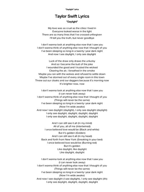 Now, let’s dive into some real-world examples to solidify our understanding of daylight lyrics meaning . A prime example can be found in Taylor Swift’s song, “Daylight.” In this song, daylight represents the clarity and self-awareness she gains after a tumultuous relationship. The lyrics explore the idea of seeing things as they truly are, embracing the present moment, and finding peace within oneself. The use of daylight here signifies a shift from darkness and confusion to understanding and self-acceptance. Another notable example is Maroon 5’s “Daylight.” While the song has a more melancholic tone, daylight still carries a significant meaning. In this context, it represents the fleeting moments of happiness and connection within a relationship. The lyrics reflect on the bittersweet nature of love and the realization that even the brightest moments can fade away. Daylight becomes a symbol of what was once cherished but is now slipping away. Bruce Springsteen’s “Dancing in the Dark” also offers an interesting perspective. Though not explicitly about daylight , the song captures the feeling of longing for something more, for a spark to ignite and bring daylight into a monotonous existence. The lyrics express a desire to break free from the shadows and find a sense of purpose and excitement. These examples illustrate how the meaning of daylight lyrics can vary depending on the context and the artist’s intent. In each case, daylight serves as a powerful metaphor, adding depth and emotional resonance to the song. By examining these examples, we can gain a better appreciation for the artistry and creativity that goes into songwriting and the ways in which lyrics can convey complex emotions and ideas. So, keep exploring different songs and artists, and you’ll discover even more fascinating interpretations of daylight in music.