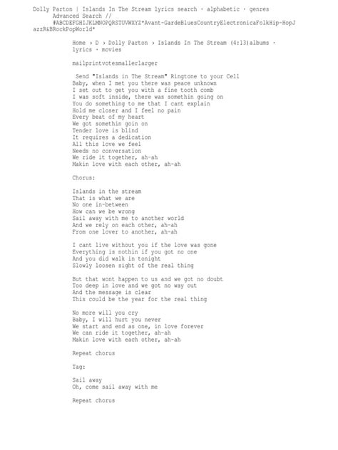 Hey guys, let’s dive into the iconic “Islands in the Stream” lyrics , a true gem from the legendary Dolly Parton and Kenny Rogers. This song isn’t just a catchy tune; it’s a story of two souls finding solace and connection amidst life’s often choppy waters. We’re talking about a song that has resonated with millions, and for good reason! It’s a beautiful duet that captures the essence of finding that special someone who makes you feel like you’re on your own little paradise, far away from all the troubles of the world. When Dolly and Kenny sing this, you can just feel the chemistry, can’t you? It’s like they were born to sing this together. So, grab your favorite drink, get comfy, and let’s break down what makes these lyrics so special and enduring.