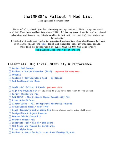 So, what exactly is a Fallout 4 modlist? Think of it like a curated collection of mods, meticulously chosen and arranged to work together harmoniously. Instead of spending hours scouring the internet for individual mods, testing them, and dealing with potential conflicts, a modlist offers a pre-packaged solution. It’s like a chef’s special, where someone else has already done the legwork of selecting the best ingredients (mods) and preparing them in a way that maximizes their flavor (compatibility and gameplay). This is super useful because it helps you to streamline the modding process. It saves time and headaches, especially for newcomers to modding. A good modlist will often include dozens, if not hundreds, of different mods, covering everything from visual enhancements and performance boosts to new weapons, armor, and immersive gameplay features. The best part? They’re usually designed to be easily installed and enjoyed, without requiring extensive technical knowledge.