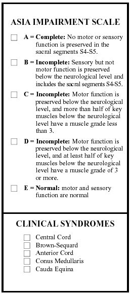 - ASIA Impairment Scale (AIS): This is a letter grade (A, B, C, D, or E) that describes the degree of impairment. We’ll get into this in more detail later, but it’s a quick way to classify the severity of the injury.
