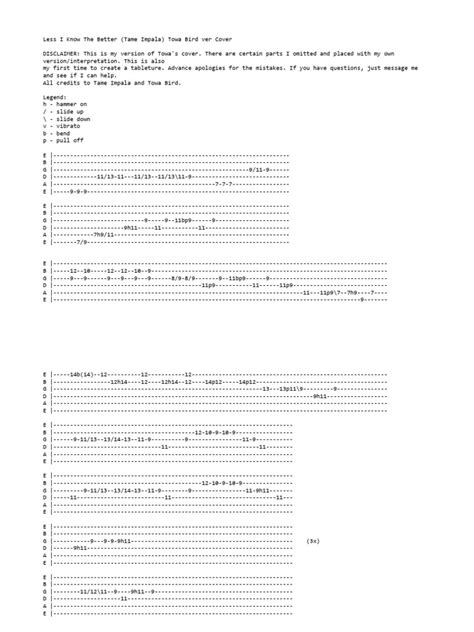 Hey guitar enthusiasts! Today, we’re diving deep into one of Tame Impala’s most infectious tracks: “The Less I Know The Better.” If you’ve been jamming out to this tune and thinking, “Man, I really need to learn that bassline and those groovy guitar parts,” you’re in the right place, guys! We’re going to break down the tabs for this absolute banger, making it super accessible for players of all levels. So grab your axe, tune it up, and let’s get this party started! Learning guitar tabs can sometimes feel like cracking a secret code, but trust me, once you get the hang of it, a whole universe of music opens up. “The Less I Know The Better” is a fantastic song to sink your teeth into because it’s got a memorable melody, a killer rhythm section, and it’s not overly complicated, making it a great stepping stone for intermediate players and a fun challenge for beginners looking to step up their game. We’ll be looking at the iconic bassline first, as that’s the driving force of the song, and then we’ll move onto the subtle but effective guitar parts that add that signature Tame Impala shimmer. Keep your eyes peeled for our detailed tab breakdowns, and don’t forget to listen to the song on repeat – it’s the best way to internalize the feel and timing of the riffs. We’ll cover the main sections, including the verse, chorus, and that epic bridge, so you’ll have a solid foundation to play along with the record. Remember, practice makes perfect, and with these tabs, you’ll be well on your way to nailing this fan favorite. Let’s get shredding!
