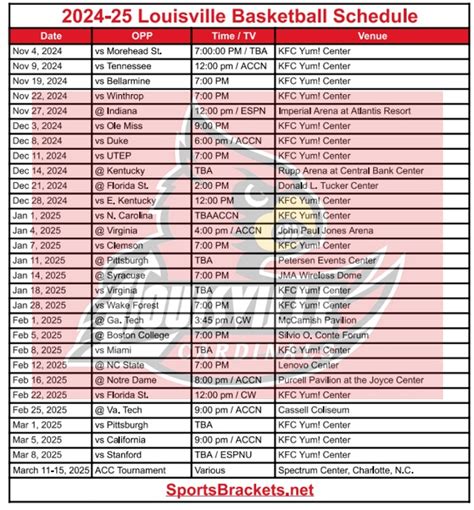 Next, you’ll find the teams playing , including Louisville and their opponent. The listing will usually indicate which team is the home team and which is the away team. Keep an eye out for rivalry games or important matchups, as these are often highlighted on the schedule. Understanding who the Cardinals are up against can add to the excitement and anticipation of the game. Knowing the opponent’s record and key players can also give you a better sense of what to expect from the game.