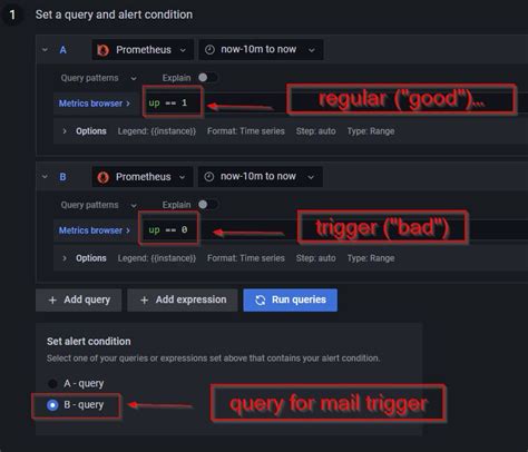 • Conditions: Here, you specify the conditions that must be met for the alert to fire. This often involves comparing the data from your query against a threshold or a range of values. This includes defining the threshold values for the metrics you are monitoring and the evaluation interval at which these conditions are checked. The configuration file allows for defining complex conditions based on multiple metrics and the application of logical operators (AND, OR, NOT).