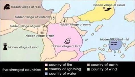 The world of Naruto is primarily dominated by the Five Great Shinobi Countries . Each of these countries has a hidden village ( kakurega ) that serves as its military force. These villages are not just places to live; they’re centers of ninja training, strategy, and defense. Let’s check them out: