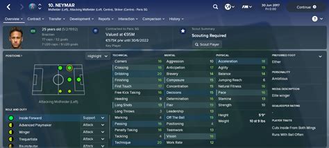 Let’s dive deeper into why the Inside Forward (Attack) role is often considered the holy grail for Neymar in FM18 . This role perfectly encapsulates his skillset: the ability to dribble past defenders, cut inside onto his stronger foot (typically his left), and either shoot or create chances. When you assign Neymar to an Inside Forward role, especially on the left flank, you’re essentially telling him to express his natural attacking instincts. He’ll start wide, looking to isolate the opposition full-back. Once he gets the ball, his dribbling , agility , and balance allow him to navigate tight spaces and evade challenges. Then comes the magic: he cuts inside. This movement immediately pulls defenders out of position, creating gaps for himself and potentially for teammates. His high finishing ensures that when he finds himself in a shooting position, the ball is likely to end up in the back of the net. His long shots attribute also means he’s a threat from outside the box, adding another layer to his goal-scoring prowess. But it’s not just about scoring. His passing and vision allow him to pick out runs from strikers or midfielders as he draws defenders towards him. He becomes a dual threat – capable of scoring himself or setting up others. To make this role truly sing, ensure he has players making runs into the box, perhaps a pacy striker or an attacking midfielder. Also, make sure your team’s width and crossing instructions complement his inside-forward movement. If your team plays narrow, he’ll have more space to operate. If you instruct your full-backs to provide width, it further stretches the opposition defense, leaving Neymar with more room to maneuver. His Composure ensures he doesn’t panic in front of goal, and his Flair means he’s capable of producing moments of individual brilliance that can change the course of a game. The Inside Forward role in FM18 for Neymar is a tactical masterpiece, designed to leverage his attacking genius and turn him into an unstoppable force.