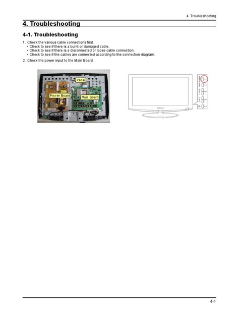 • Display Issues: These problems are related to the picture quality and can manifest in several ways. The screen might be blank, show distorted images, or have colored lines. In some cases, the backlight might fail, causing the screen to appear dark. These issues can be caused by problems with the display panel, the T-CON board (Timing Control board), or the internal wiring.