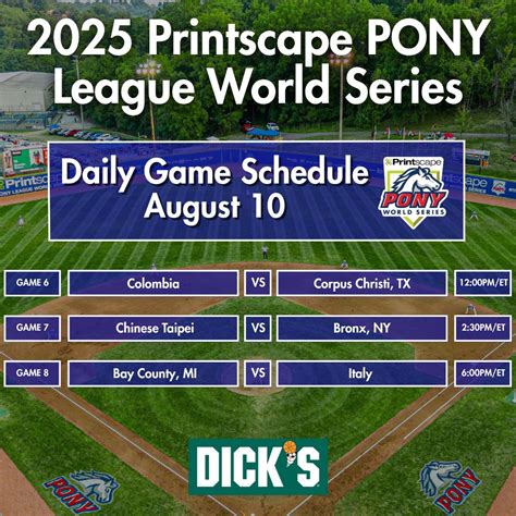 As the Pony World Series 2025 approaches, keeping track of the important dates and times is crucial. The tournament usually spans several days, with games starting in the morning and continuing throughout the day. Opening ceremonies are often a highlight, kicking off the series with fanfare and introducing the participating teams. The championship game is the culminating event, drawing the largest crowds and maximum excitement. Make sure you check the official Pony Baseball website or other reliable sources for the exact dates, game times, and any special events. Planning ahead will help you make the most of the series and enjoy every moment of this remarkable baseball experience. The complete schedule will be available closer to the event, so mark your calendars to avoid missing out on any of the crucial match-ups.
