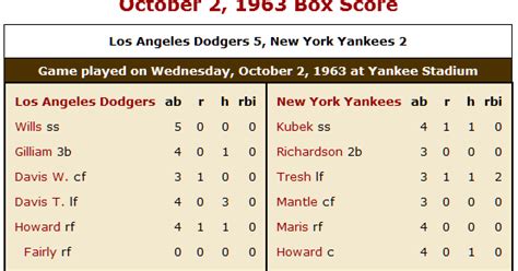 For those of you who might be new to the world of box scores, don’t sweat it! It might seem like a jumble of numbers and abbreviations at first glance, but trust me, it’s pretty straightforward once you get the hang of it. Think of the box score as the essential summary of the game, providing a play-by-play breakdown of each team’s performance. It includes vital information like runs, hits, errors, and individual player stats. We’ll break down the key components so you can easily understand what’s happening. The box score is divided into sections, typically showing the runs scored by inning, along with team totals. Key stats for each player include at-bats (AB), runs scored ®, hits (H), runs batted in (RBI), and other crucial data that shows how they impacted the game. This game’s box score is a time capsule, preserving the performance of legendary players. Mastering the box score allows you to appreciate the game’s nuances. Let’s delve into the specific stats and what they mean for the PSEI 1963 World Series Game 1 . Pay close attention, because understanding these metrics is key to appreciating the brilliance of the players and the ebb and flow of the game.