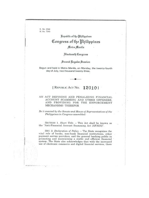So, what exactly is Republic Act No. 12010 ? At its core, the Anti-Financial Account Scamming Act (AFASA) is a landmark piece of legislation designed to combat the ever-growing problem of financial scams targeting individuals and businesses across the Philippines. It’s like giving us all a stronger shield and the authorities more powerful swords to fight against those who try to trick us out of our money through deceptive financial schemes. Before AFASA, dealing with financial scams often felt like a whack-a-mole game, with perpetrators disappearing into the digital ether or operating in legal grey areas. This act aims to plug those loopholes and provide a more robust legal framework for prosecuting these offenders. It recognizes that financial scams aren’t just minor annoyances; they can devastate individuals, families, and even cripple small businesses. The law specifically targets fraudulent activities that involve financial accounts, such as unauthorized transactions, identity theft leading to financial loss, and various forms of online deception designed to extract sensitive financial information. It’s not just about catching scammers after the fact; it’s also about deterring them through stricter penalties and clearer legal definitions of what constitutes financial scamming. The AFASA also emphasizes the importance of collaboration between financial institutions, law enforcement, and the public in identifying and reporting fraudulent activities. This collaborative approach is vital because scammers are constantly evolving their methods, making it a continuous battle to stay ahead. By enacting Republic Act No. 12010 , the government is sending a clear message: financial scamming will not be tolerated, and perpetrators will be held accountable. This law is a significant step towards creating a safer and more trustworthy financial ecosystem for everyone in the Philippines. It’s designed to be comprehensive, covering various aspects of financial fraud and ensuring that victims have a clearer path to seeking justice and recovering their losses, where possible. The spirit of the law is to protect the financial integrity of individuals and the economy as a whole, making it a critical piece of legislation for our digital age.