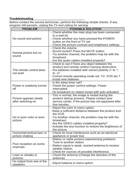 1. Identify the Problem: Start by clearly defining the issue. Is it a picture problem, sound problem, power issue, or remote control problem? Write down the problem and what you see and hear.