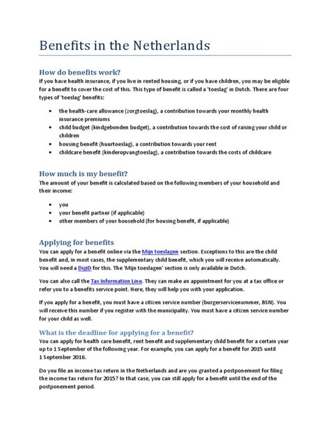 Each type of benefit has its own specific criteria too. For example, child benefits (Kinderbijslag) are available to parents of children under 18, regardless of their income. Housing benefits (Huurtoeslag) depend on your rent amount, income, and household size. Healthcare benefits (Zorgtoeslag) depend on your income and the cost of your health insurance premiums.