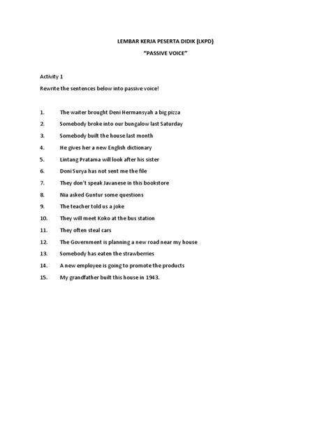 Alright, it’s time to get our hands dirty and practice what we’ve learned! Your LKPD is packed with exercises to help you master the passive voice. These exercises are designed to guide you from basic understanding to advanced application. So, what kind of activities can you expect to find? Primarily, you will encounter the transformation exercises , where you convert sentences from active voice to passive voice. For example, you might be given an active sentence, such as, “The chef cooked the meal,” and you need to transform it into its passive form: “The meal was cooked by the chef.” In addition to the transformation exercises, the LKPD includes fill-in-the-blank activities . In these, you’ll be given sentences with missing words, and you’ll have to use your knowledge of the passive voice to fill in the blanks. These can range from choosing the correct auxiliary verb to identifying the past participle of a verb. Further, you’ll work with sentence-building exercises . These exercises require you to construct complete sentences in passive voice based on provided prompts or cues. They are a fantastic way to develop your writing skills while practicing grammar. Moreover, the LKPD also presents comprehension questions where you will read passages and answer questions that require you to identify and understand sentences in passive voice. This is important because it tests your ability to spot passive voice sentences in real-world contexts, and also makes it a bit more applicable. Then, the LKPD could incorporate some creative writing prompts , such as writing a short paragraph using the passive voice to describe a scene or event. This will make it even more enjoyable. Lastly, the LKPD contains error correction exercises , where you need to identify and correct errors in passive voice sentences. These are extremely useful for improving your overall accuracy and understanding. The exercises are designed to be progressive, starting with simple tasks and gradually increasing in difficulty. Make sure you take it step by step, and don’t hesitate to refer back to the rules and examples we discussed. You will be a passive voice pro in no time.