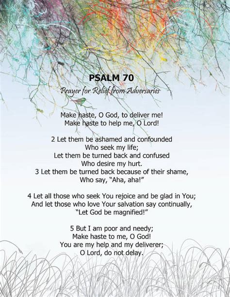 So, how can we apply the lessons of Psalm 70 to our lives today? Psalm 70 ’s message is timeless and can be applied to various aspects of our modern lives. First and foremost, embrace the urgency in your prayers . When you’re facing a crisis, don’t hesitate to cry out to God for immediate help. Don’t feel like you need to compose the perfect prayer; just be honest and vulnerable with God about your needs. Remember, He already knows what you’re going through, so there’s no need to hide anything. Be specific in your requests. Don’t just say, “God, help me.” Instead, identify the specific problem you’re facing and ask God for a specific solution. The more specific you are, the easier it will be to recognize God’s hand at work in your life. Also, trust in God’s timing . While Psalm 70 emphasizes the need for urgent help, it’s important to remember that God’s timing is not always our timing. He may not answer our prayers immediately, but that doesn’t mean He’s not listening. Trust that God is working behind the scenes to bring about the best possible outcome in your situation. In addition, find strength in community . The psalmist wasn’t alone in their struggles; they were part of a community of believers who shared their faith and supported one another. Surround yourself with people who can encourage you, pray for you, and help you stay focused on God during difficult times. Furthermore, extend grace to others . Just as the psalmist sought justice for themselves, we should also seek justice for others who are being oppressed or mistreated. Stand up for the vulnerable, speak out against injustice, and be a voice for those who cannot speak for themselves. Remember, we are all part of the same human family, and we are called to love and care for one another. Plus, cultivate a heart of gratitude . Even in the midst of difficult circumstances, the psalmist expressed gratitude to God for His goodness and salvation. Take time each day to thank God for the blessings in your life, no matter how small they may seem. Gratitude will help you maintain a positive perspective and keep your focus on God’s faithfulness. Finally, memorize Psalm 70 . Its brevity makes it easy to commit to memory, allowing you to have a powerful prayer readily available whenever you need it. Recite it during times of stress, anxiety, or uncertainty, and let its words fill you with hope and confidence in God’s deliverance. By applying these practical lessons to our lives, we can experience the same hope, comfort, and strength that the psalmist found in Psalm 70. It’s a timeless message that continues to resonate with believers today.